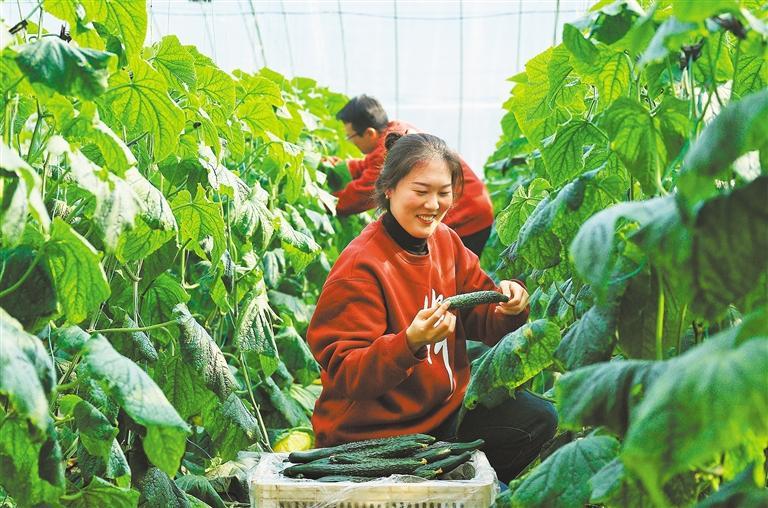 绛县郝庄乡网络助农志愿者在蔬菜大棚帮助农户采摘黄瓜。当地采用种植、管理、采收、运输、结算的“五统一”模式,让“菜篮子”鼓起农民的“钱袋子”。