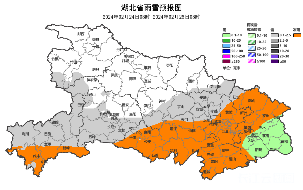 24日08时-25日08时,十堰、襄阳、随州、宜昌北部、荆门北部阴天;神农架、恩施北部、宜昌南部、荆门南部、孝感有小到中雪;恩施南部、荆州、天门、潜江、仙桃、武汉、鄂州、黄冈北部、咸宁有冻雨或冰粒;黄冈南部、黄石有小雨。最高气温大部地区0~3℃,最低气温大部地区-2~1℃。偏北风2到3级。
