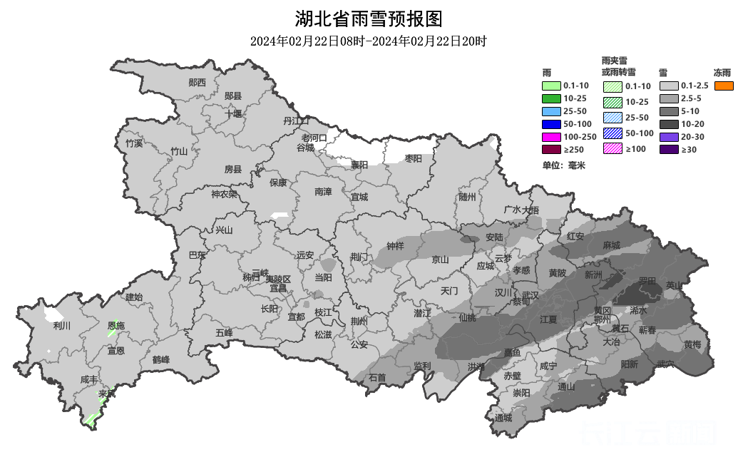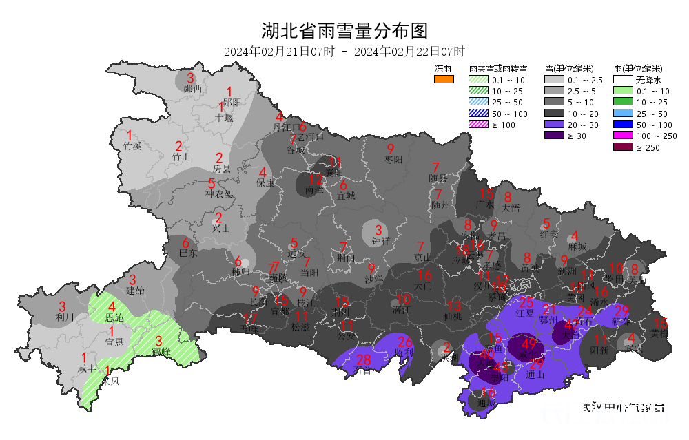 昨日(2月21日)07时至今日(2月22日)07时,神农架、襄阳、孝感、随州、宜昌、荆门、潜江、天门、仙桃、武汉、黄冈中北部、鄂州、黄石、咸宁出现大到暴雪或冰粒,咸宁、荆州、黄石等地出现特大暴雪,伴有冻雨,其他地区小雪、雨夹雪或冰粒。