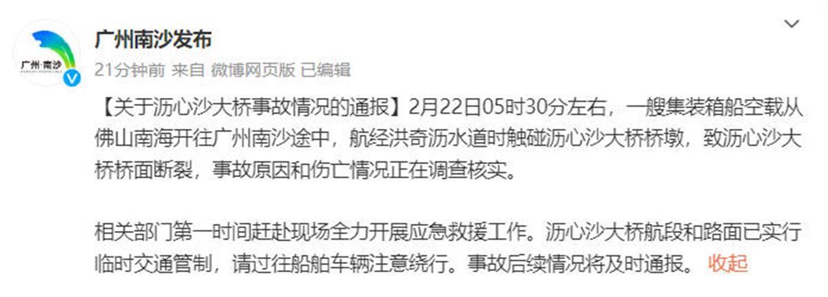 2月22日,广州市南沙区万顷沙镇沥心沙大桥被船只撞击,桥体断裂,有桥上车辆落水,目前伤亡情况正在核实。事发道路已实行交通管制,相关部门正在现场处置。