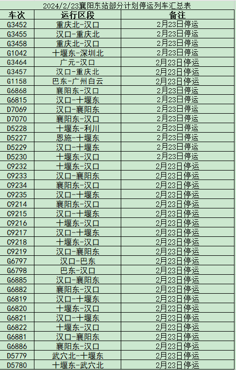 湖北日报讯(记者胡祎、通讯员袁广益)从襄阳东站获悉,受冰雪天气影响,2月23日以下列车计划停运,停运列车主要集中在汉十高铁沿线。铁路部门提醒,冰雪天气复杂,请旅客出发前及时关注12306App推送的有关信息,妥善安排行程。