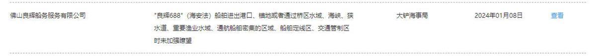 记者查询发现,2024年1月8日,“良辉688”(海安法)船舶进出港口、锚地或者通过桥区水域、海峡、狭水道、重要渔业水域、通航船舶密集的区域、船舶定线区、交通管制区时未加强瞭望,被罚款3万元。