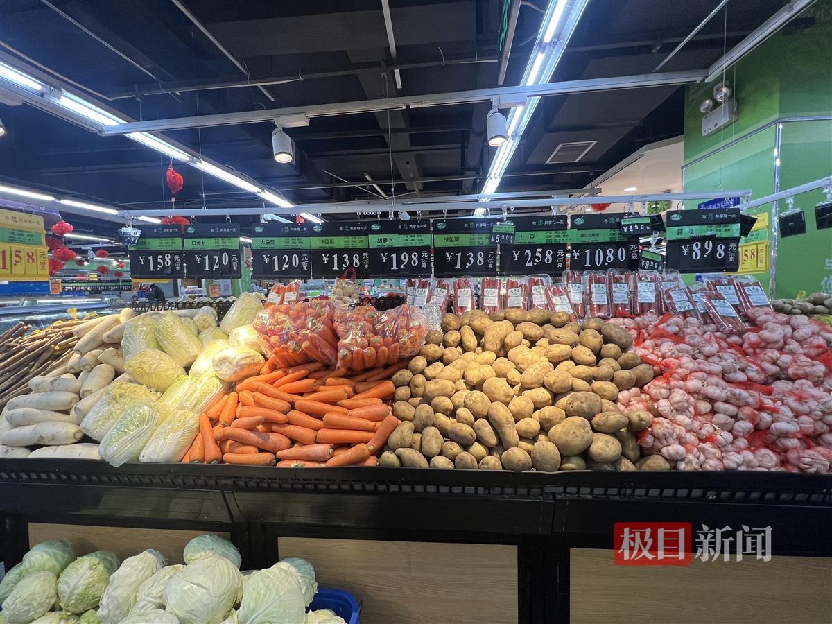 在武商量贩常青花园店,蔬菜品种同样非常齐全,供应充足,价格平稳。其中,白萝卜、大白菜、紫甘蓝、土豆价格分别为0.78元/斤、0.99元/斤、2.99元/斤、2.28元/斤。