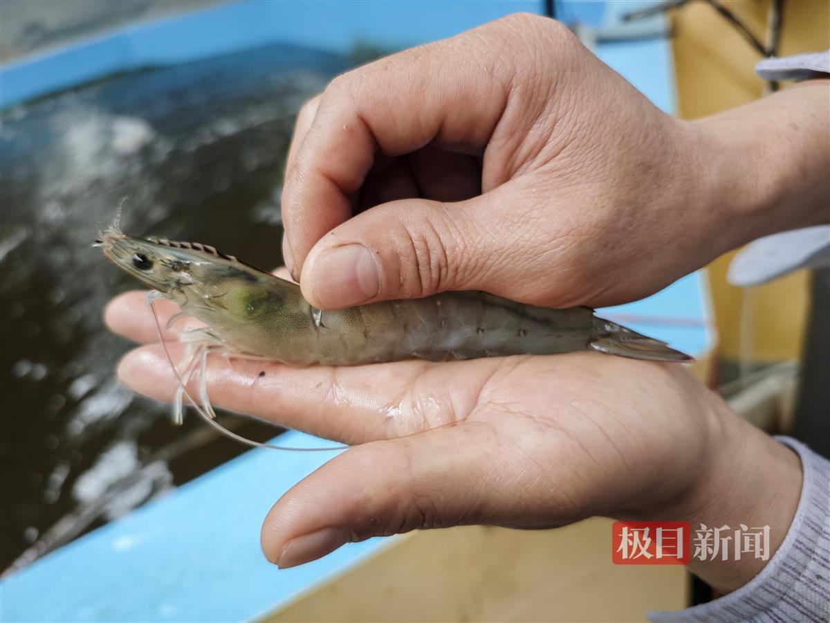 技术员高寒沿着水池一一查看水体以及浮在水面活动的南美白对虾情况,时不时用打捞网从池底捞起一网活虾检测虾体生长情况,只见落网南白美对虾一个劲儿地在网上弹跳,十分活跃。取一只成虾放在手掌上,差不多有巴掌那么长。高寒介绍,当规格达到一斤在25至40头左右,才可以出塘,单只成虾的身长可以达到12到15厘米左右。
