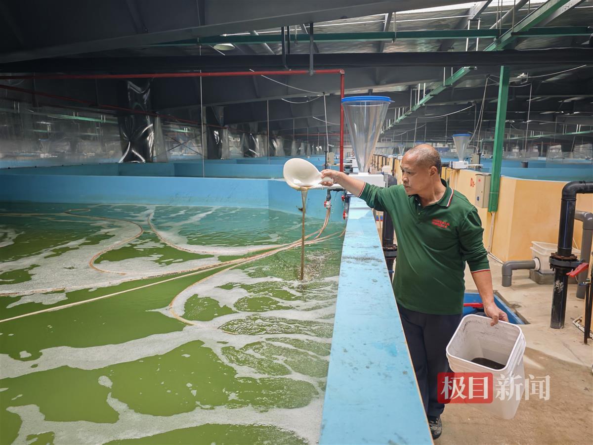 今年春节假期是该科技示范园正式运营后迎来的第一个春节。2月20日,极目新闻记者探访该基地。尽管室外寒风凛冽,大雨倾注,厂区饲养室内却是温暖如春,放眼望去,一个个蓝色的水池整齐划一排列开来,每个池内住着1万多只南美白对虾。当天上午9时,养殖工人们正在为池内的南美白对虾投喂饲料。