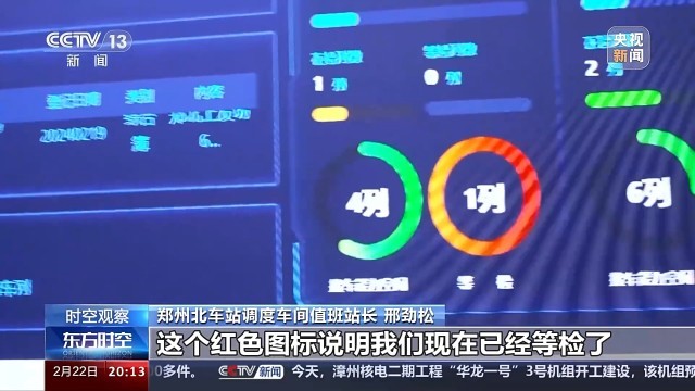 郑州北车站调度车间值班站长邢劲松:三种图标,你看黄色图标说明我们检车能力不太紧张,然后绿色图标说明我们接车能力空闲,红色图标说明我们现在已经等检了。今天我们白班基本上开了三列化肥煤车,通过大数据服务我们的春耕生产。