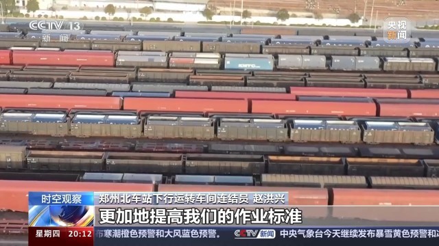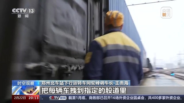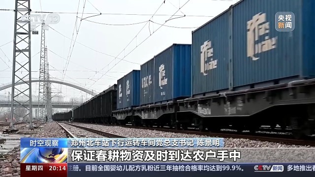 总台央视记者蒋树林:这里是郑州北车站,也是全国作业量最大的编组站,大家看我眼前这个车里面装的就是当下春耕所急需用的化肥原料,作业还在加班加点地往前推进。
