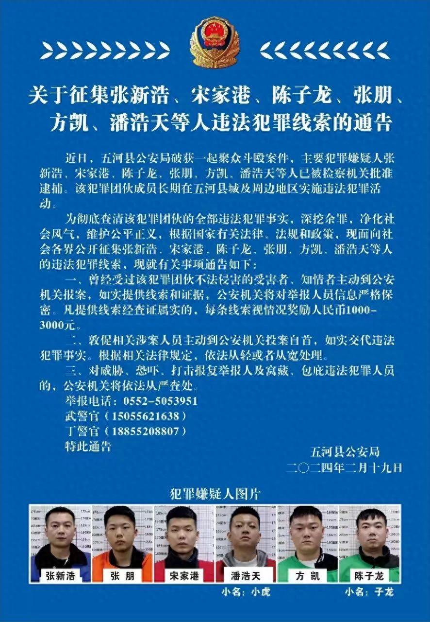 2月19日,安徽五河警方发布关于征集张新浩、宋家港、陈子龙、张朋、方凯、潘浩天等人违法犯罪线索的通告。