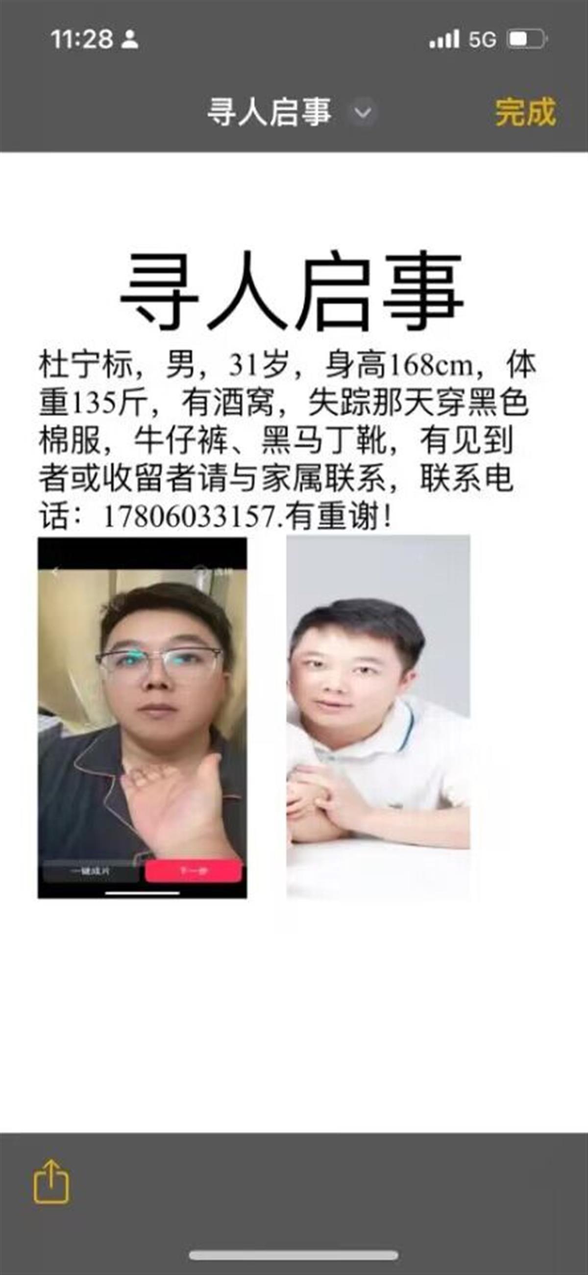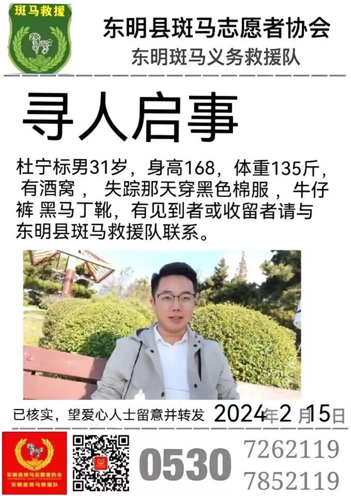 “老公,快回来吧!我们家不能没有你。”连日来,山东省东明县的朱女士在网上发布多条信息,向网友悬赏征集关于丈夫杜宁标下落的线索。2月8日晚,杜宁标酒后从亲属的车上下车,随后蹊跷失踪,数百名救援队搜寻多日未果,只找到了他的手机和眼镜。