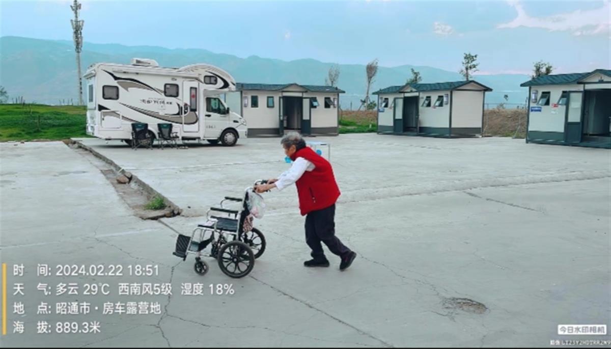 最近两天,王先生一家旅行到了巧家县,因为是带着百岁老母亲旅行,他们一到房车营地就引来其他游客的关注。一位来自山西的房车旅行者还特意在短视频网站发文:“在巧家栗喉峰虎营地见到一个不可想象的旅行者,这个照片中的老人是我旅行旅居这么多年来见过的最年长的老人……步履蹒跚,靠轮椅扶行……如此的高龄腰已经直不起来了,但是她就出来过一下很多身体健康的人不敢做的事……”