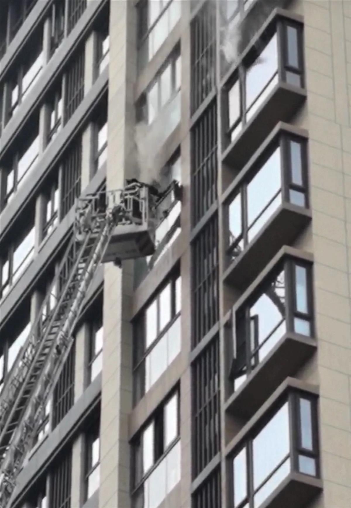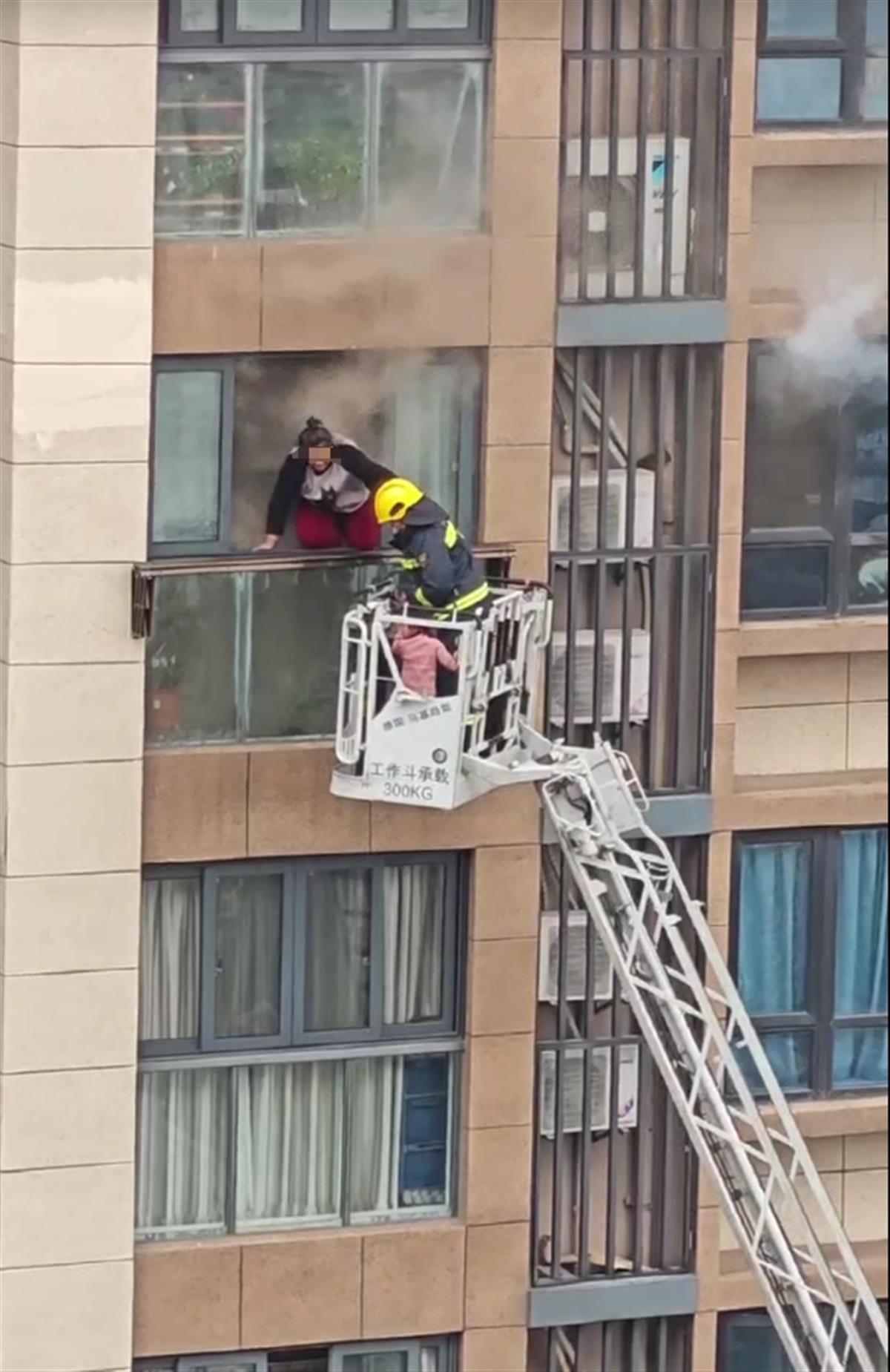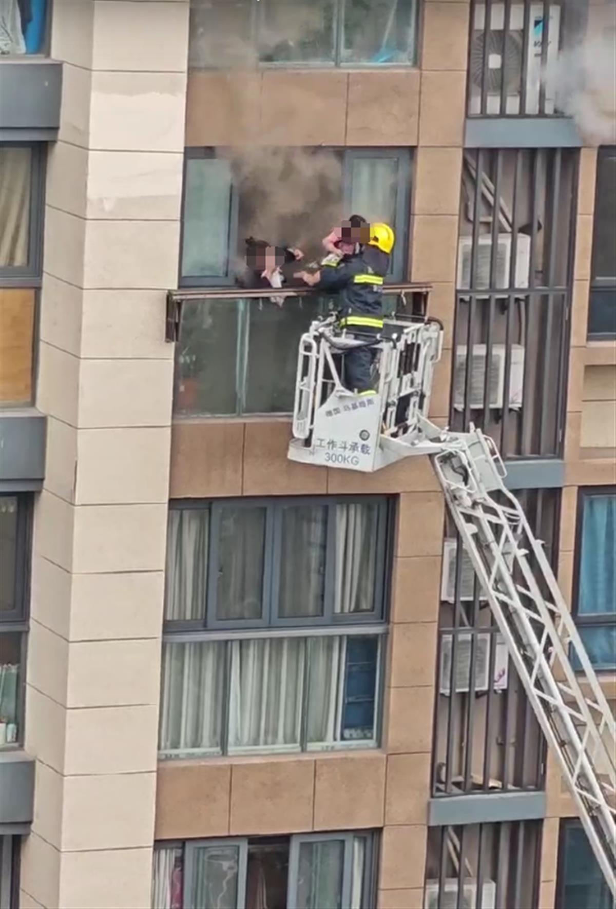 现场视频显示,一高层民宅突发火灾,屋内冒出火焰和大量浓烟。多辆消防车赶到现场处置,一名消防员借助云梯,将被困在屋内的一名成年女子和一名女童转移到云梯的工作斗内。
