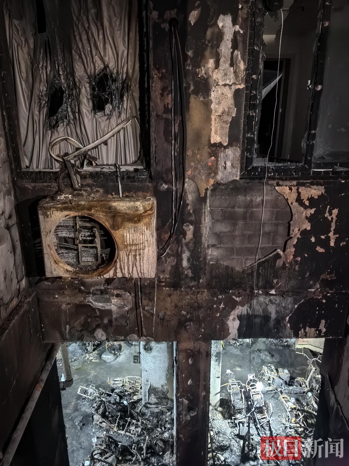 24日,极目新闻记者在该失火单元楼核心区域看到,一楼架空层有大量被烧毁的电动自行车残骸,以及被烧毁的充电桩残骸,呈灰黑色,地面被灰黑色的水覆盖。沿着与架空层紧邻的天井向上看去,天井的墙体已被熏黑。记者在近处看到,架空层与二楼间一处空调外机熔化后已变形。天井周围,是楼道、居民家厨房及房间窗台,窗框被严重烧毁。