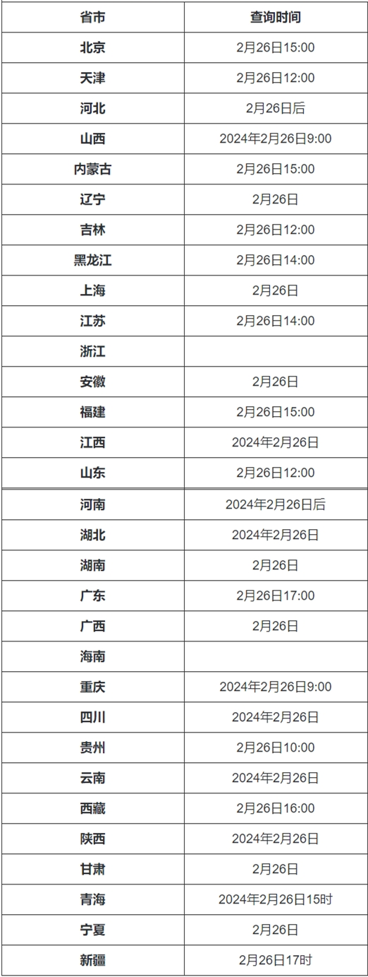 山西、重庆考生可于26日9时起查询;天津、吉林、山东考生可在26日12时起查询;黑龙江、江苏考生可以在26日14时起查询;北京、福建、青海、内蒙古考生可于26日15时起查询;广东、新疆考生可于26日17时起查询。详见>>2024研考初试成绩查询时间汇总