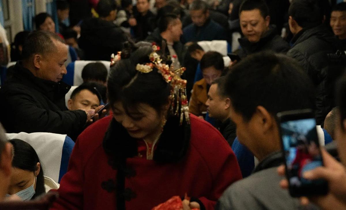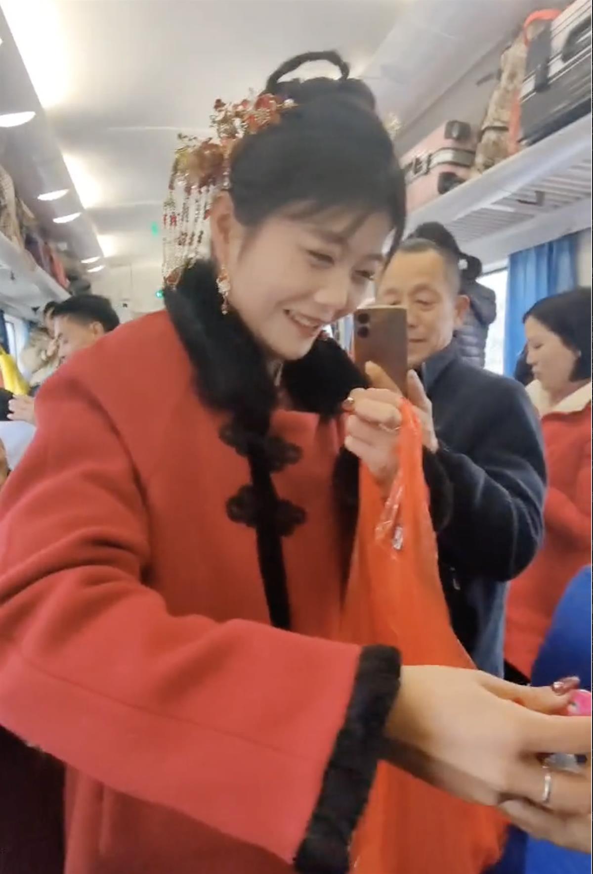 “我们是2月22日做下决定的,随后我就买了票。”侯女士说,从龙山县坐火车去怀化,要从重庆市黔江区转车,第一段行程她买到了卧铺票,第二段却只买到了无座票。2月24日,在和家人从黔江换乘列车前往怀化时,侯女士是有些害怕的:“我看列车进站时,车厢里已经站了很多人,我们的行李又比较多。但上车后,他们很多人帮我们看行李,大家还轮流让座给我,并且纷纷送上了祝福。”侯老师称,当时列车上非常热闹,这些乘客让她感觉很温暖,穿着红衣喜服的她也向大家发喜糖,让大家沾沾喜气,这一幕被随行人员拍了下来,侯老师也分享到了网上。
