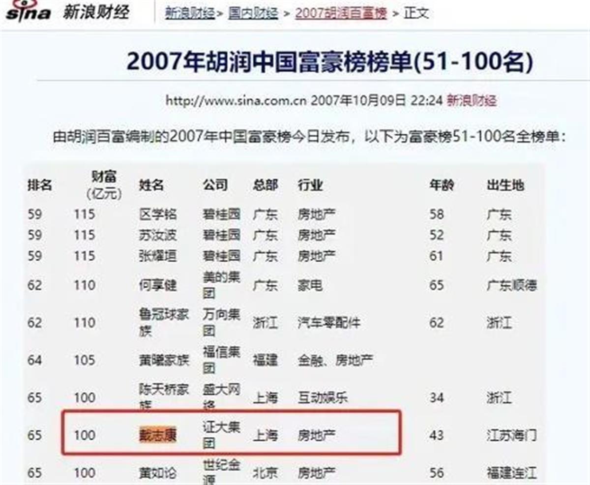 据每日经济新闻26日晚报道:戴志康旗下的“证大系”投资版图涉足地产、金融、文化等多个领域,2007年身家高达100亿,跻身胡润中国富豪榜。