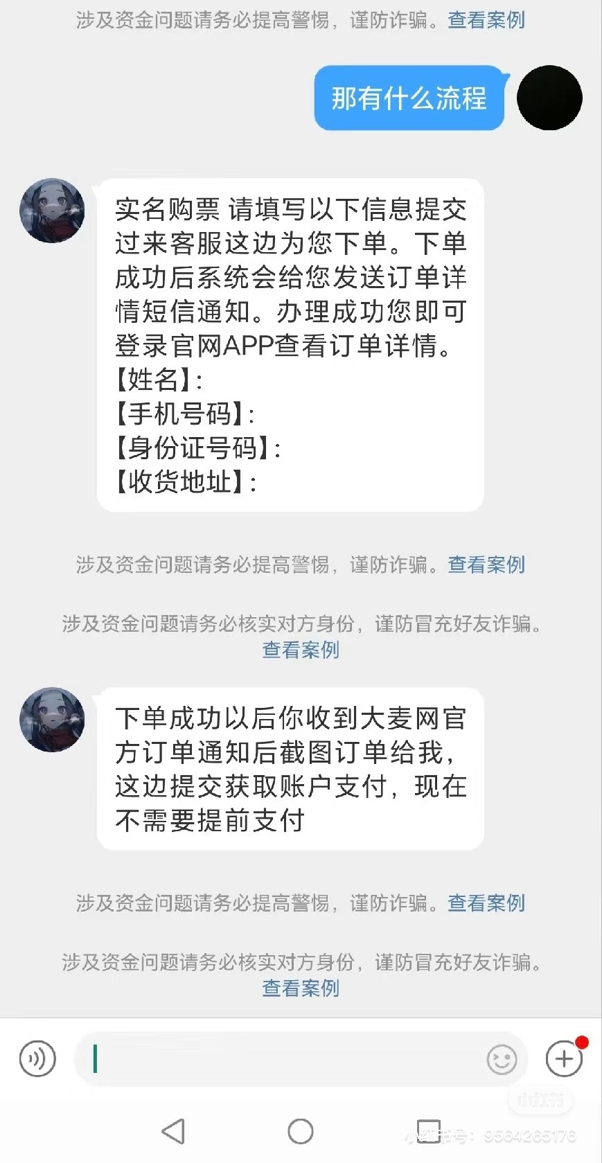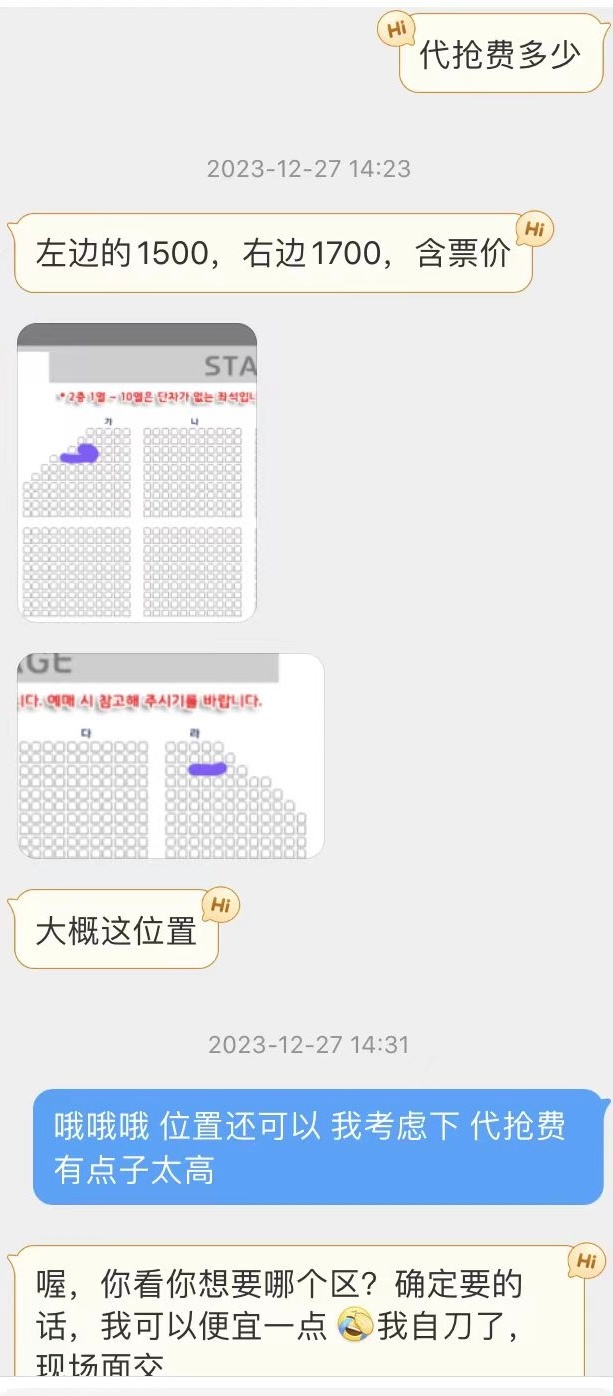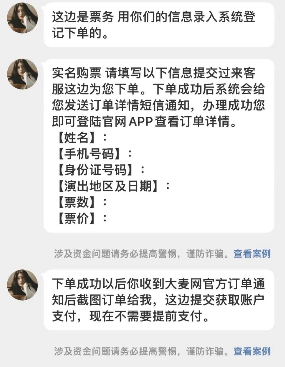票务:现在都是实名制录信息,如果你那边要买的话,就确定是谁去看,然后把他的信息给我,要多少钱的然后卖多少钱一张,到时候你把信息给我就得了,当天就是刷你的身份信息和脸,我这边把信息给你录入之后,会存在票夹里边,到时候你直接进就行了。