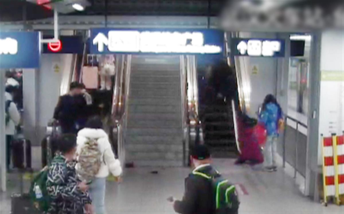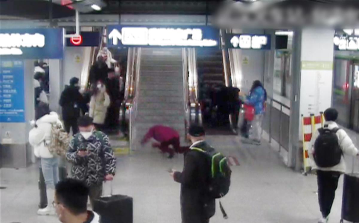 地铁站的手扶电梯上,一名女乘客失去重心摔倒,附近一名地铁工作人员见状飞奔冲上前,途中两次不慎摔倒,直至跪地爬过去按下紧急停梯按钮,避免了更大危险的发生。
