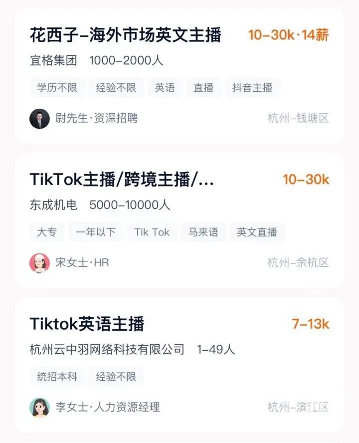 在BOSS、猎聘等招聘平台上,也有大量企业近期发布了海外运营、主播等相关岗位的人才招聘。今年刚开年,东方甄选就在某招聘平台发布了多个TikTok方向的职位,包括内容运营经理、商务经理、TikTok海外店铺运营等,工作语言为英文,月薪在2万-4万元之间。