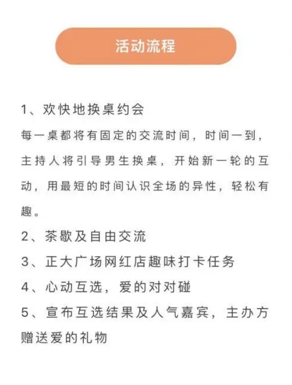 主办方包下了一个餐厅,将60多名参与者分为10桌,每桌有8-10分钟的沟通时间,时间一到主持人将引导男生换桌,开始新一轮的互动,用最短时间认识全场异性,最后统计男女嘉宾之间的互选结果,并公布成功配对的“cp”。