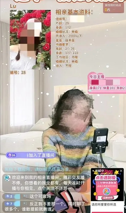 近年来,为了扩大社交范围实现尽快“脱单”,一些单身青年选择进入短视频直播间。在直播间,相亲者的身高、颜值、职业、收入、房子、车子等基本条件摆在明面上,被一轮一轮地打量和筛选。