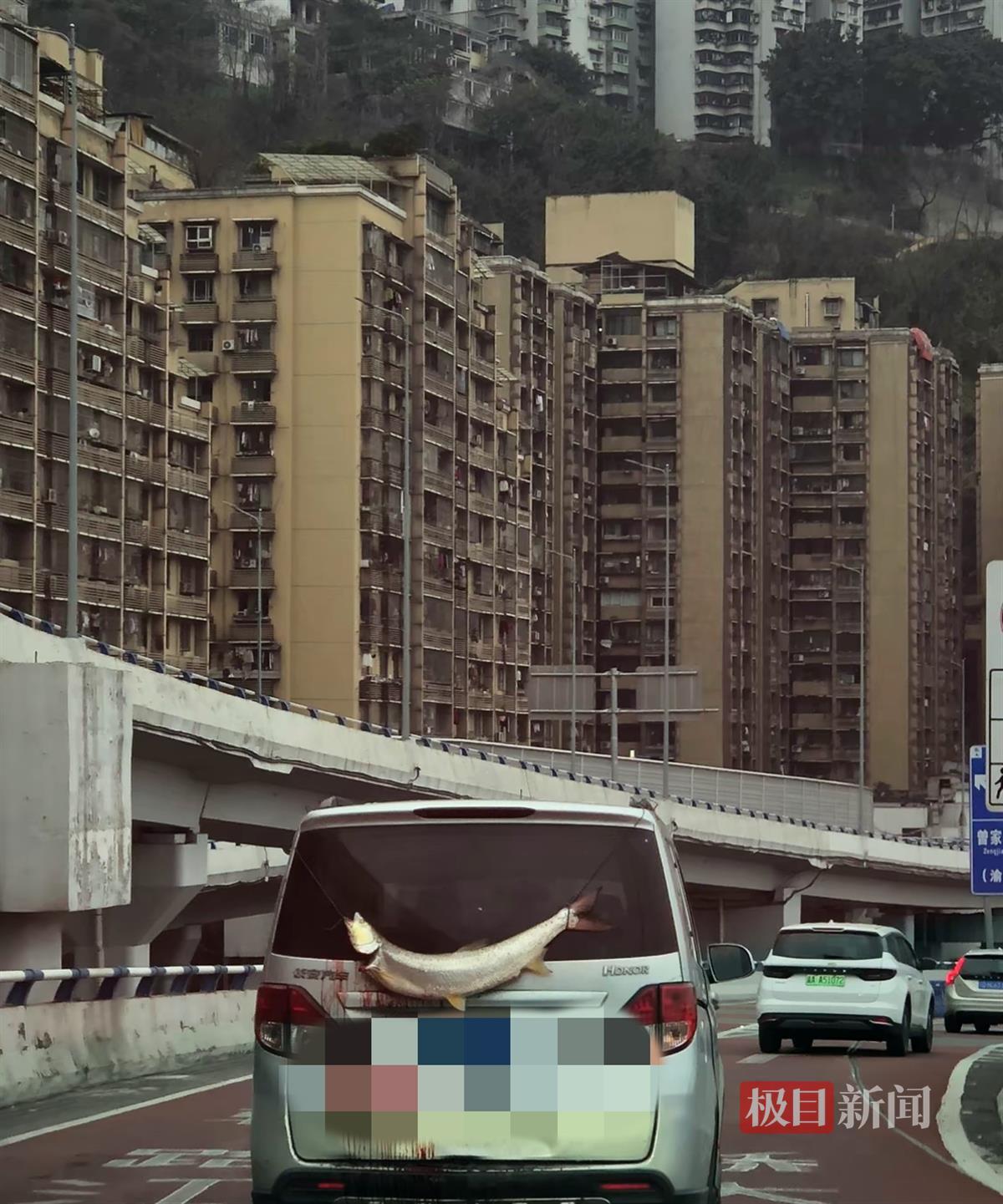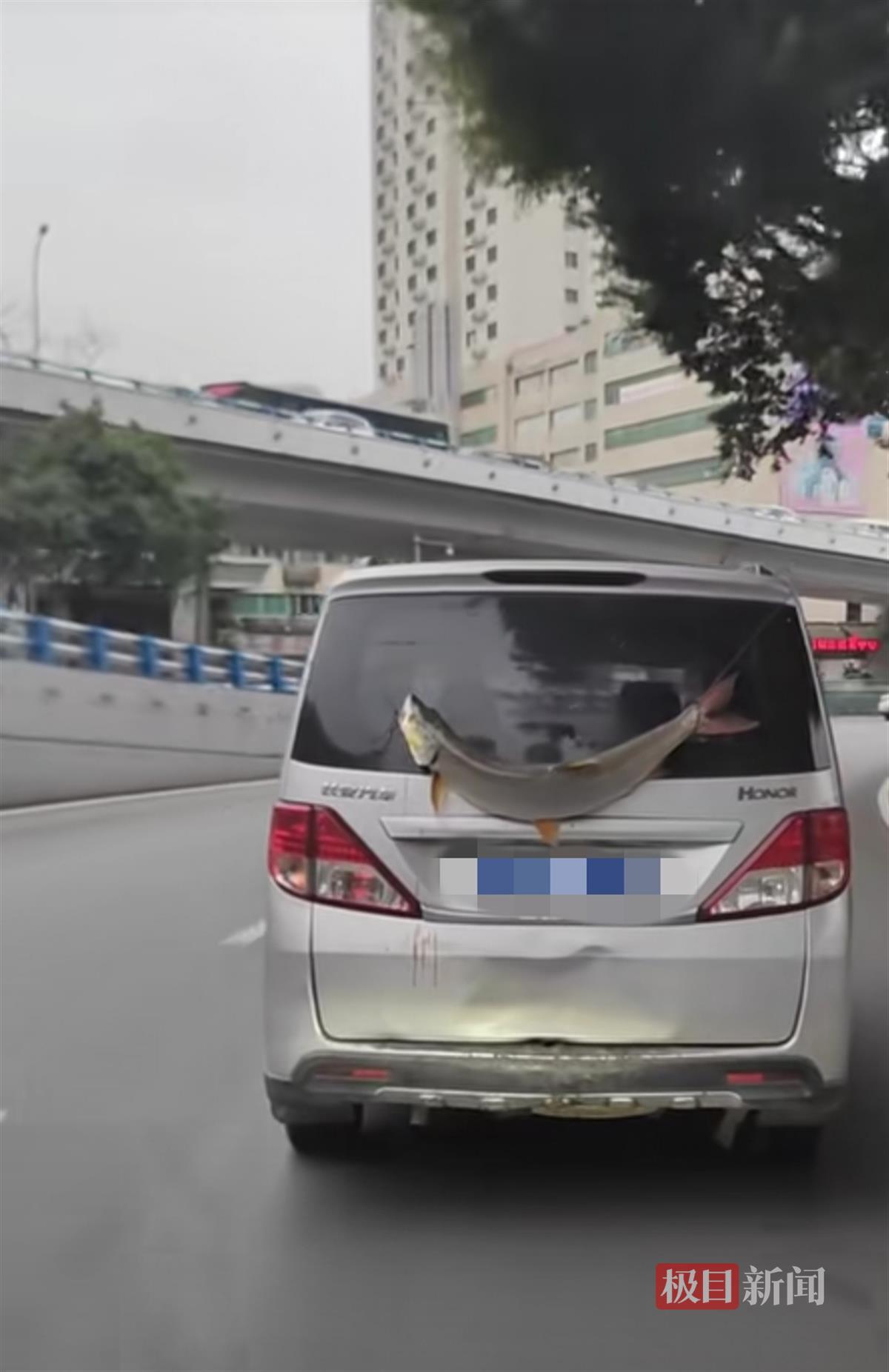 极目新闻记者在杨先生拍摄的视频中看到,大鳡鱼头尾被绳子拴着挂在面包车的尾门上,面包车在路上穿行。在评论区,见过这辆车的其他网友也发出了视频。一位网友发出图片称,27日上午他驾车从菜园坝往曾家岩方向经过,也看到这辆挂着鱼的面包车。