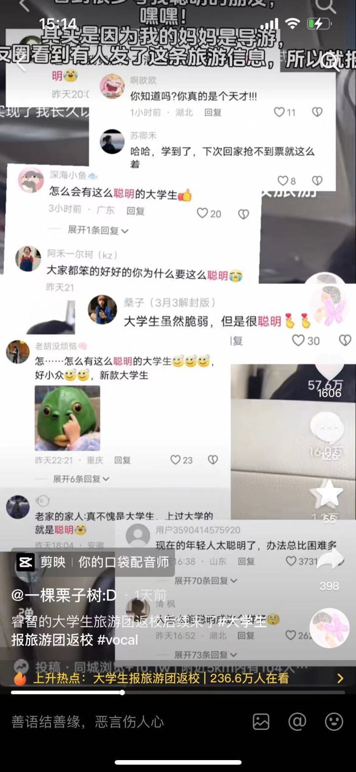 近日,一则关于#大学生报旅行团返校#的消息在网上引起了热议。据悉,这些大学生为了假期结束后能够按时返校,因为买不到车票竟然选择报名参加旅行团,与游客一起前往学校所在城市。这一做法引起了网友们的广泛关注和讨论,许多人表示赞同:好小众的上学方式!思路瞬间打开,上学游玩都不耽误。
