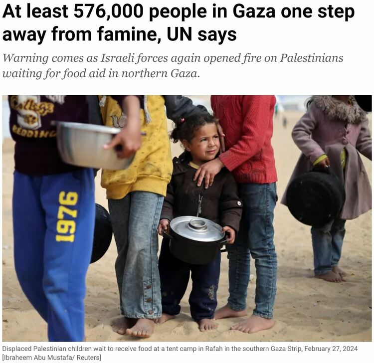 世界粮食计划署副执行干事卡尔·斯考当天警告说,这是“世界上儿童营养不良最严重的程度”。“如果不改变,加沙北部的饥荒将迫在眉睫”。