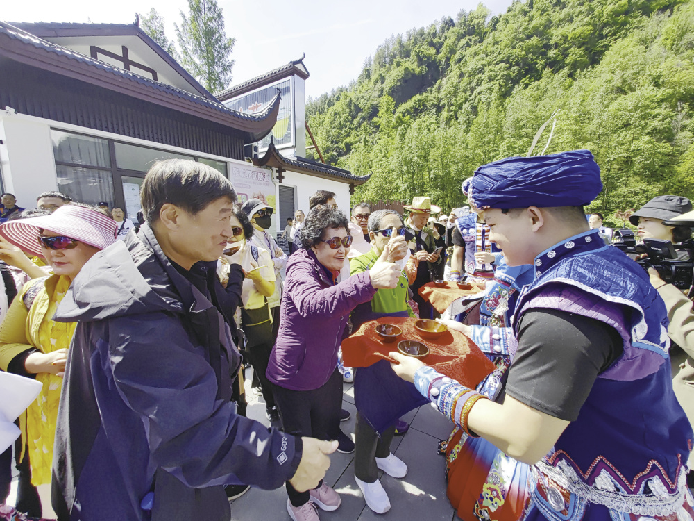 2023年4月,韩国游客在张家界国家森林公园体验拦门酒。