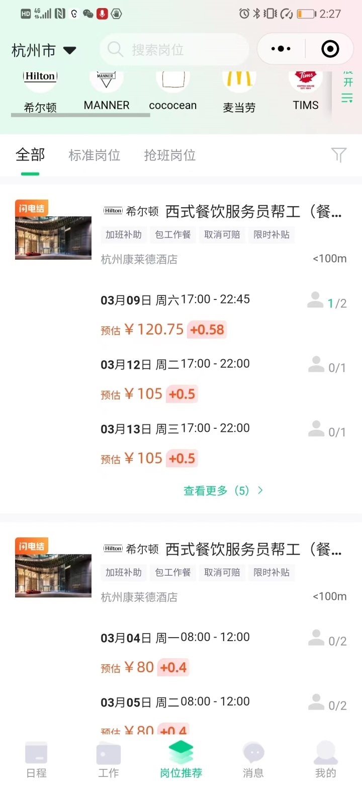 “在微信小程序上搜了一下打零工的关键词,结果就发现了杭州康莱德酒店招零工。”因为之前学过餐饮,他顺利入职,平时烤牛排、生蚝,帮忙自助餐开餐,时薪22元每小时。