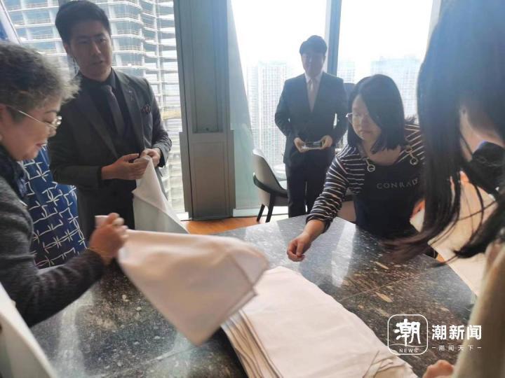 “多叠几次就熟练了。”看到记者有两张叠好的餐巾没有对齐边,同事轻声给予鼓励。