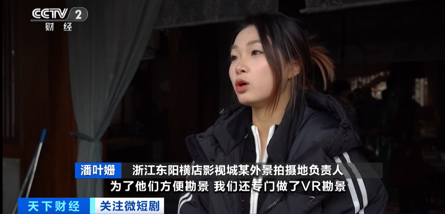 浙江东阳横店影视城某外景拍摄地负责人潘叶姗:一天最多接待过六七个微短剧组,道具都弄好,可以节省他们的成本。我们有皇宫大殿、府邸大厅、客栈、牢房等场景。为了方便,我们还专门做了VR勘景。