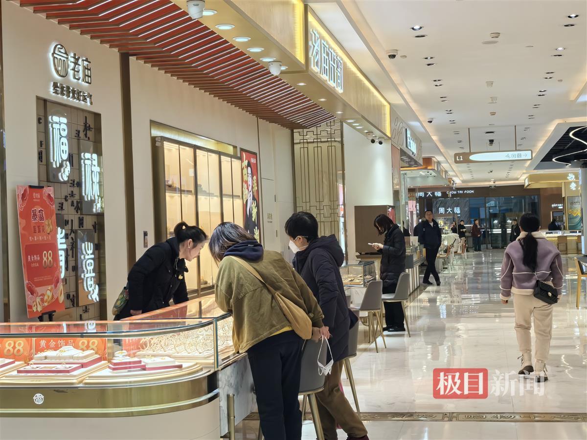 3月7日上午,在武商MALL,极目新闻记者看到,尽管是工作日,仍有不少消费者正在挑选黄金首饰,其中多数是孩子买给母亲。他们多表示,黄金饰品的设计越来越年轻化,可供选择的款式多,同时黄金的保值功能也很吸引人。