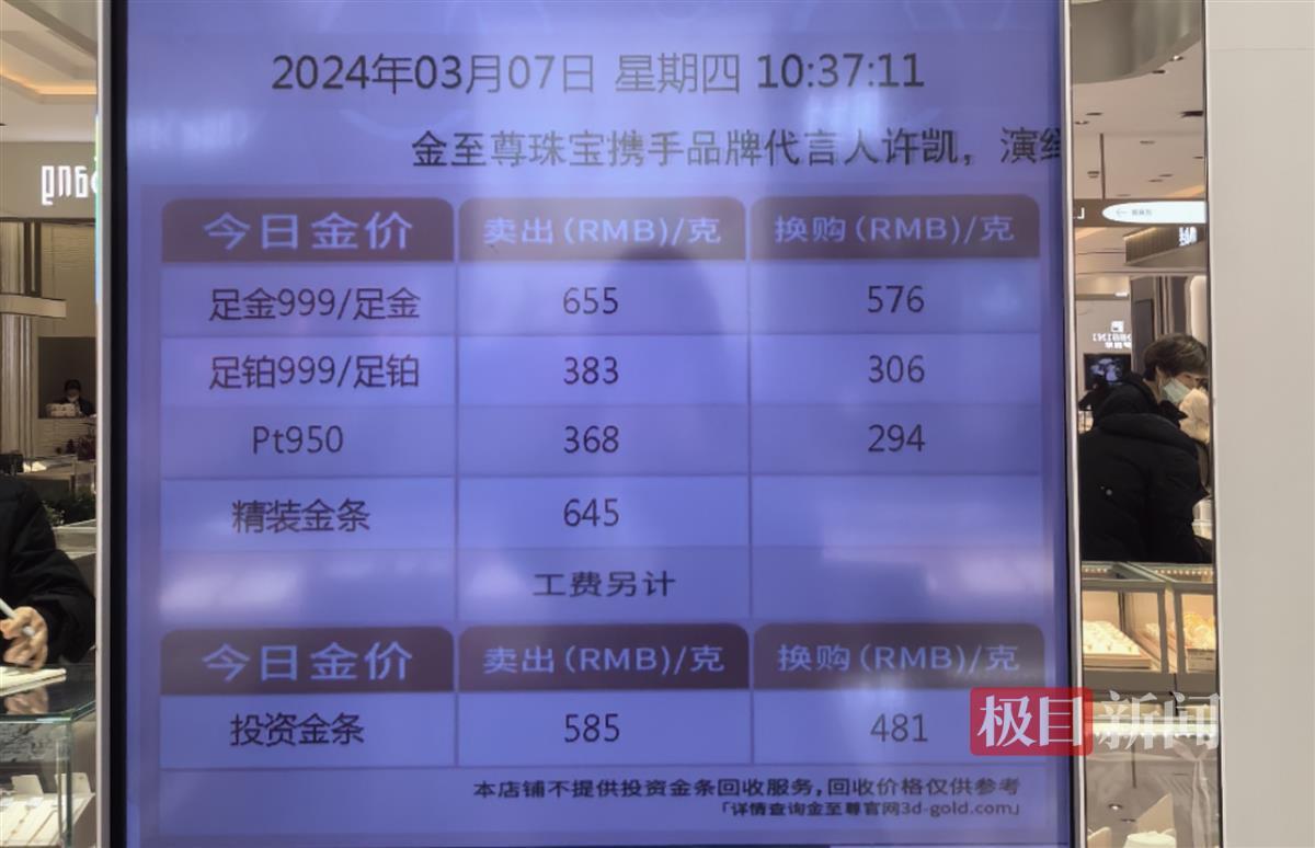 “又涨了”“眼睛一闭一睁每克又涨了10元”……记者探访时,不断有消费者感叹,最近的金价可以说是一天一个价。例如3月4日黄金饰品价格为635元/克,3月5日是645元/克,一夜涨了10元;3月6日到了650元/克,而到了7日则变成了655元/克。不断有销售人员劝说消费者“早点下手”,称“最近都不会跌的”。