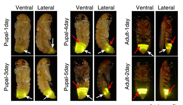 图为5至7天的蛹期中,萤火虫成虫发光器从无到有,快速发育成熟并发光。(付新华教授团队供图)