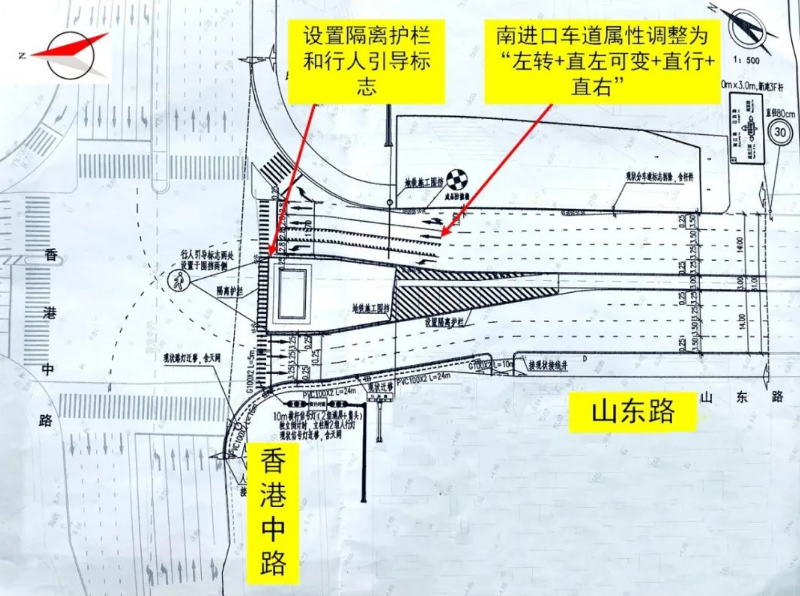 因地铁八号线五四广场站施工需要,自2024年3月11日至2024年12月30日占用香港路山东路路口南侧施工,调整路口南口车道属性。具体方案如下: