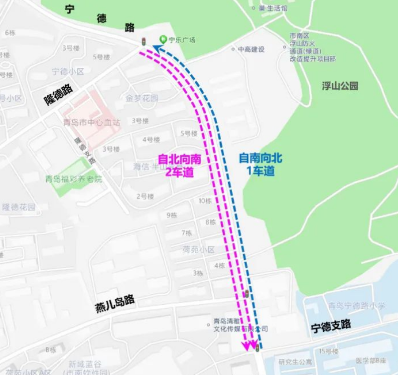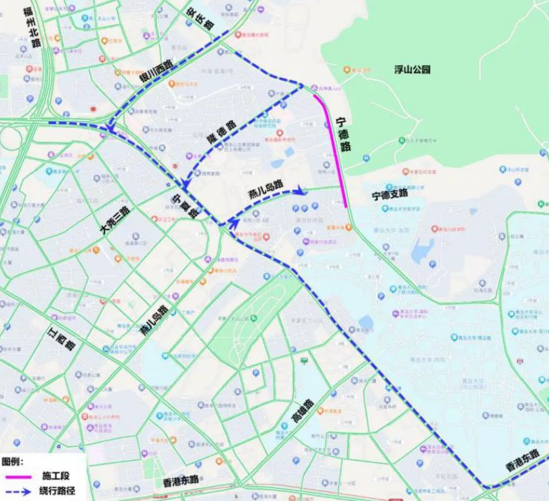 2、原宁德路北向南前往青岛软件园方向的车辆,可沿宁德路—隆德路—宁夏路—燕儿岛路绕行。
