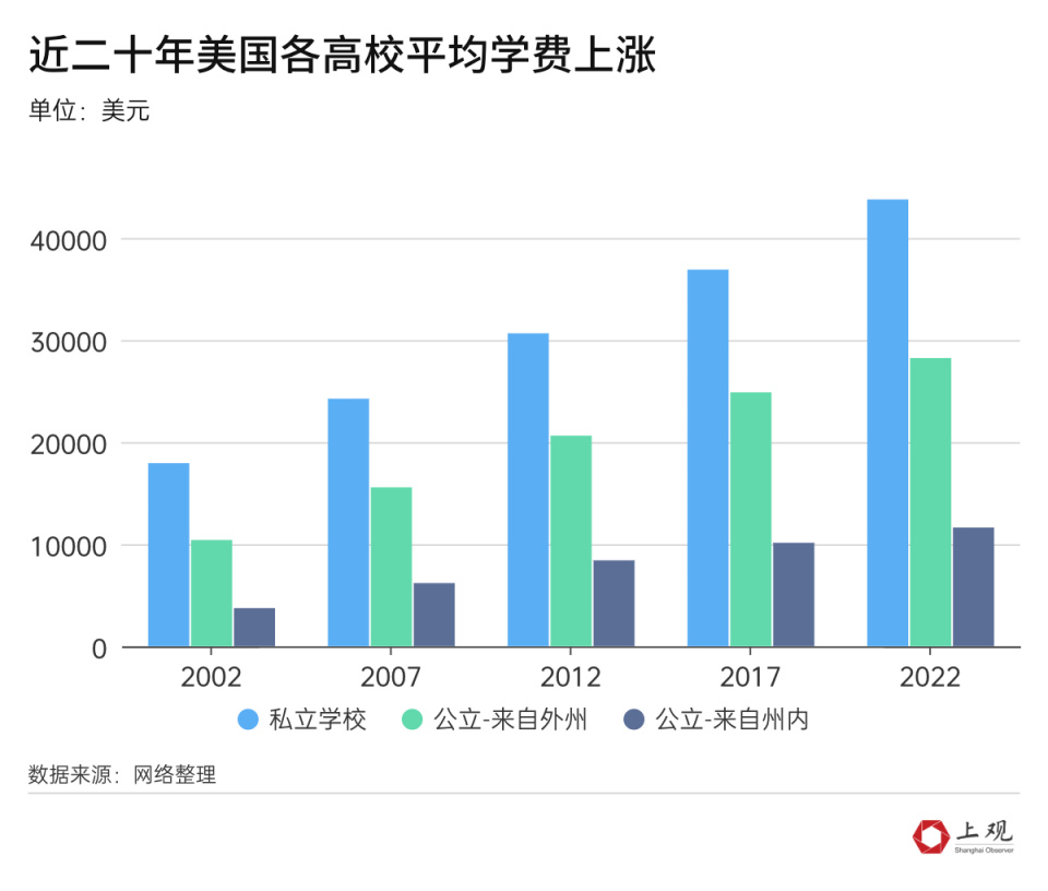 数据显示美国公立大学学费相比2002年平均上涨了170%至211%。而私立大学本身学费较贵,2022年平均学费为4.38万美元,相比20年前也涨了144%。
