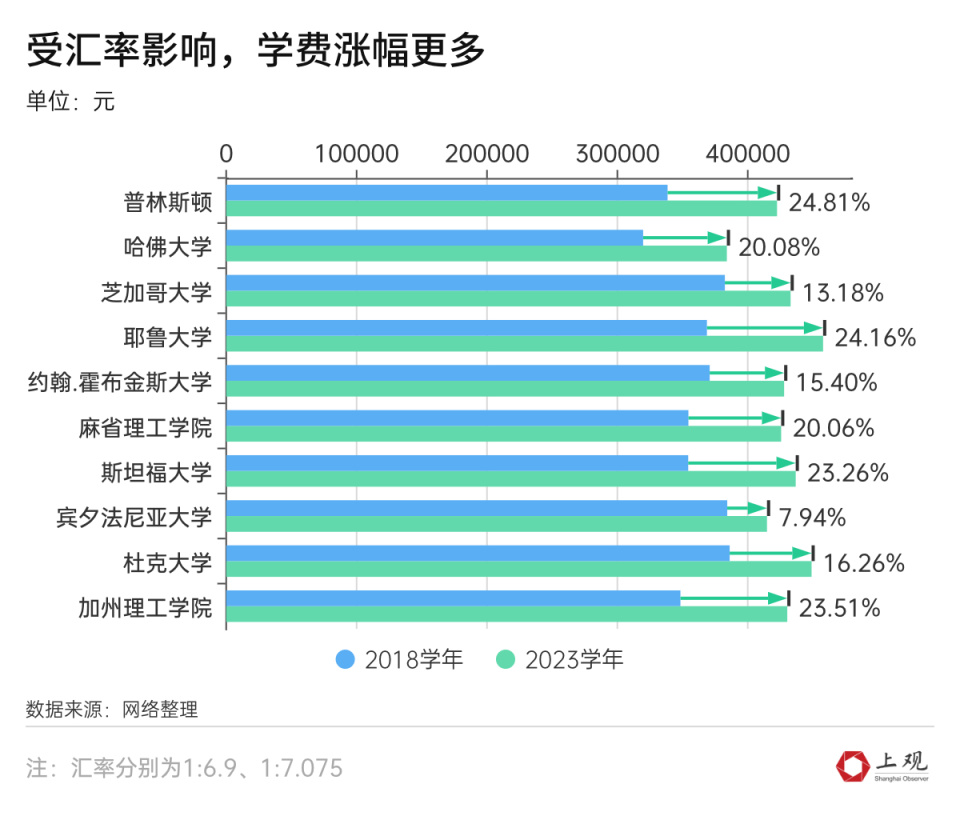 按人民币计算,上述十所学校2023学年的平均学费达到43万元,比2018年多了约7万元。