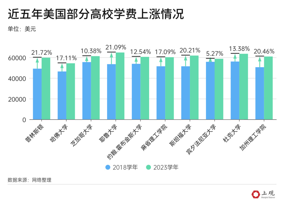 以几所知名度最高的名校而言,相比2018学年,2023学年的学费哈佛涨了17%,普林斯顿、耶鲁和斯坦福都涨了20%多,涨幅最低的宾大也涨了5%,美国大学的学费已普遍超过每年6万美元。