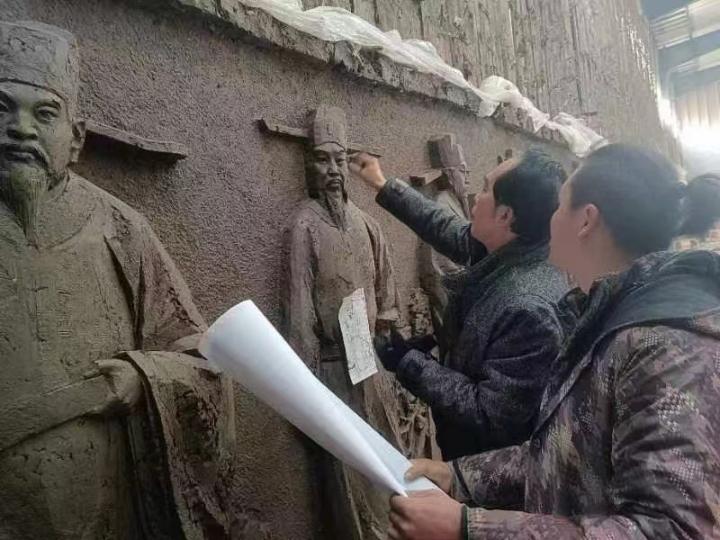 为了体现不同人物的气质差异,在整个创作过程中,安滨总是认真“拿捏”这些人物的面部特征的五官细节与神情,体现其内在气质和性格特征。绘稿这些国之栋梁的重臣,安滨在造型的神貌上彰显了其“气度”和“仪范”。在“泥塑的过程中,助手会就这些人物的身材、位置进行塑造,但人物眼神、眉宇和嘴唇间流露出的神情的准确性,都是我来调整,包括造型与人物动态的那股劲,比如,某个宰相,肩膀要拉起来,身形再转过去一点。要呈现如陈骙这样的人物气质,他们的理解和表现还达不到。”从现场工作照中,可以看到安滨改动过程中的专心与严格。