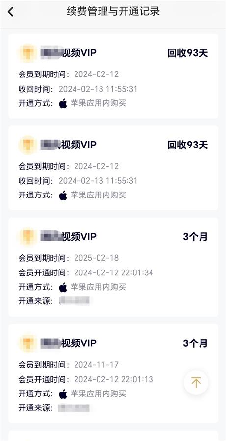 视频会员开通记录 (APP截图)
