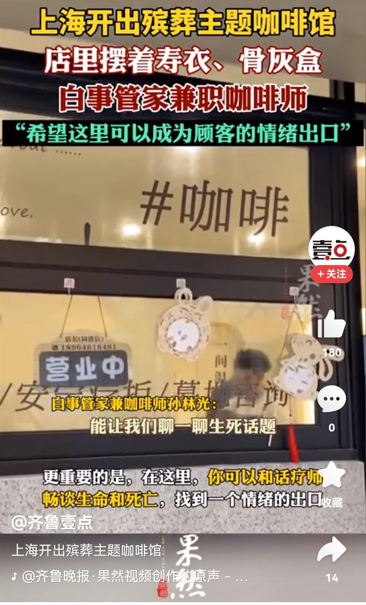 据齐鲁壹点3月14日报道,上海开出殡葬主题咖啡馆,店里摆着寿衣、骨灰盒,白事管家兼职咖啡师。店方表示,希望提供这样一个地方,能让我们来聊一聊生死话题,在这里,你可以和别人畅谈生命的死亡,找到一个情绪的出口。