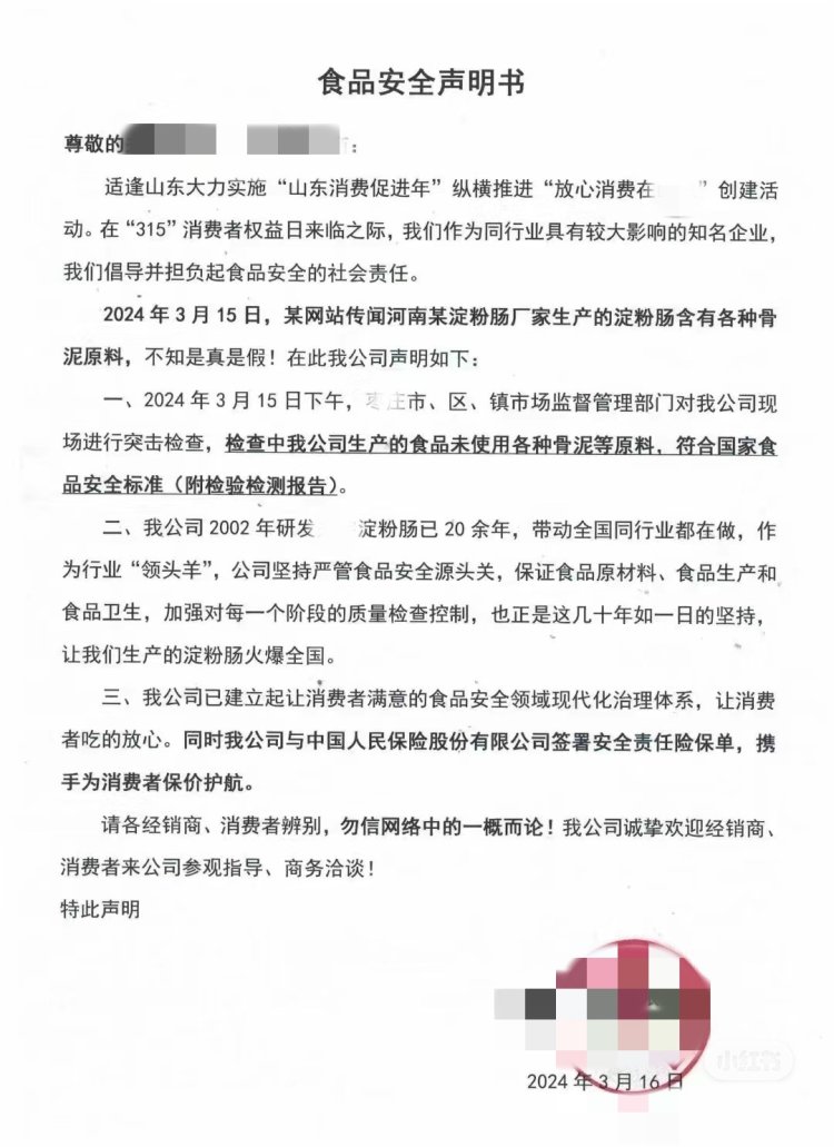 还有一些生产淀粉肠的厂家也开始通过公布相关质检报告、厂家生产视频等方式自证清白。某厂家公布了《食品安全声明书》,在该《声明书》中提到,当地的市场监管部门对该公司进行了现场突击检查,检查其生产的食品未使用各种骨泥等原料,符合国家食品安全标准。