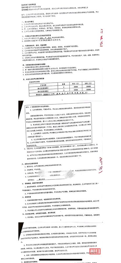在王先生提供的代理商经营协议书中,极目新闻记者看到,其还有义务从事相关产品的销售。2022年11月,王先生表示陆续谈下了中国石油等客户,并与他们签约向他们提供品牌洗车机。但因厂家一直以春节物流停运等借口,导致迟迟未发货。“最终,已签约客户以合同违约为由起诉了我,我只能向客户进行道歉和赔偿。”王先生说。