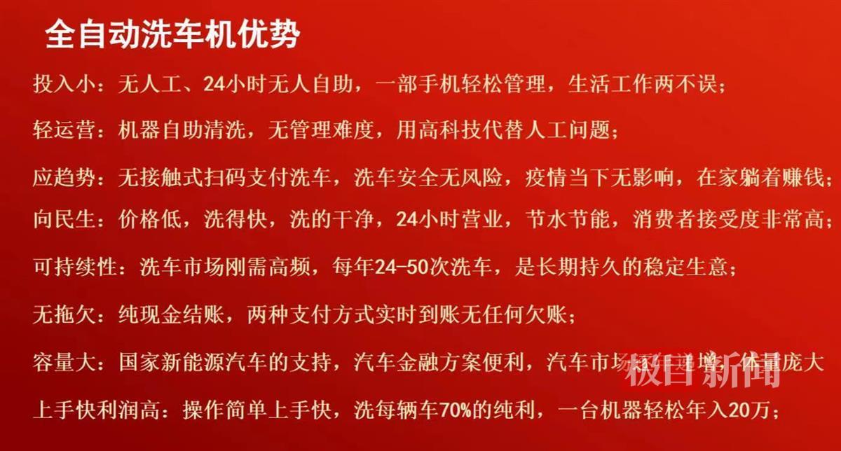 “2022年6月,我在网上偶然刷到某品牌的洗车机广告,当时宣称购买这种洗车机,可24小时自动清洗,能减少人工劳动成本,在家用一个手机APP就能实现运维管理。”3月15日,武汉市民王先生向极目新闻反映,当时认为这款高科技产品很有投资价值,于是在当年7月就与洗车机生产公司签订了总金额为29.5万元的经营协议书。