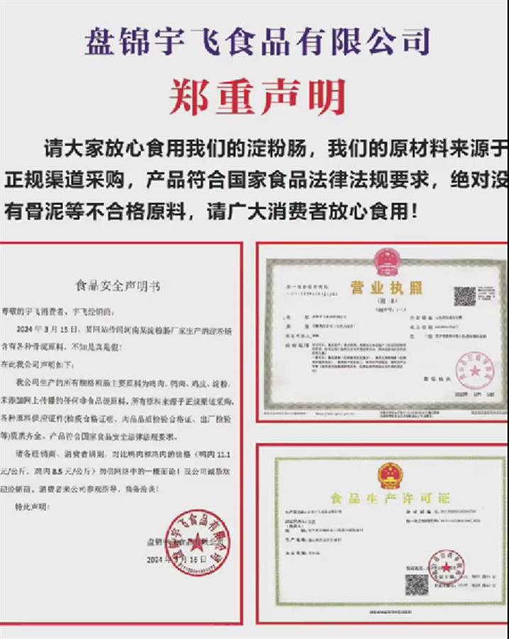 各大淀粉肠生产厂家也纷纷发表声明,称从未使用骨泥作为原材料,有厂家甚至在生产车间直播,企业负责人在上万网友的围观中吃下自家的产品。