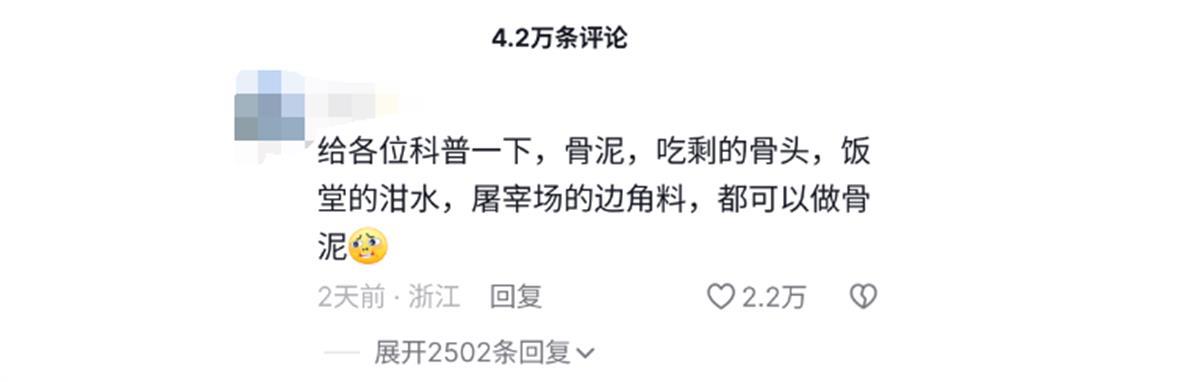 一时间,“淀粉肠塌房”成为热搜词。甚至有不少网友在评论区表示,“吃剩的骨头、饭堂的泔水、屠宰场的边角料都可以做骨泥。”上述媒体报道中提及的几家淀粉肠厂家,被不少网友理解为在淀粉肠中使用了骨泥。
