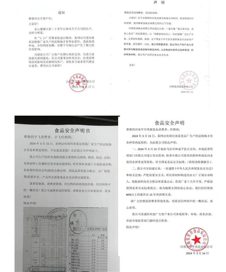极目新闻记者注意到,报道中被提及的河南省开开食品有限公司、河南双润食品有限公司、盘锦宇飞食品有限公司、山东夫宇食品有限公司相继发布食品安全声明,均称公司使用的原料和成品未使用各种骨泥等原料,符合国家食品安全标准;并提示广大经销商和消费者切莫误信网络中的一概而论,放心食用。其中,山东夫宇食品有限公司还向广大客户承诺,如受此网络传闻影响无法销售,请联系当地拿货代理进行退货,费用由公司承担。