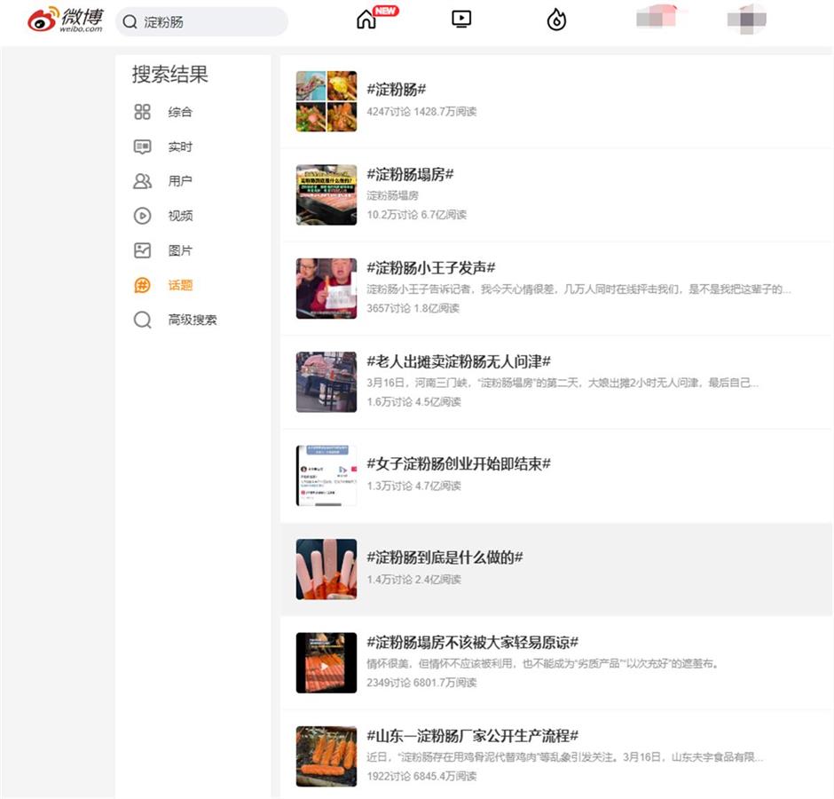 “淀粉肠塌房”“女子淀粉肠创业开始即结束”“淀粉肠到底是什么做的”……从3月15日开始,与淀粉肠有关的话题,一条接一条地登上微博等各平台热搜榜单,仅在微博平台,就有多条话题阅读量过亿。