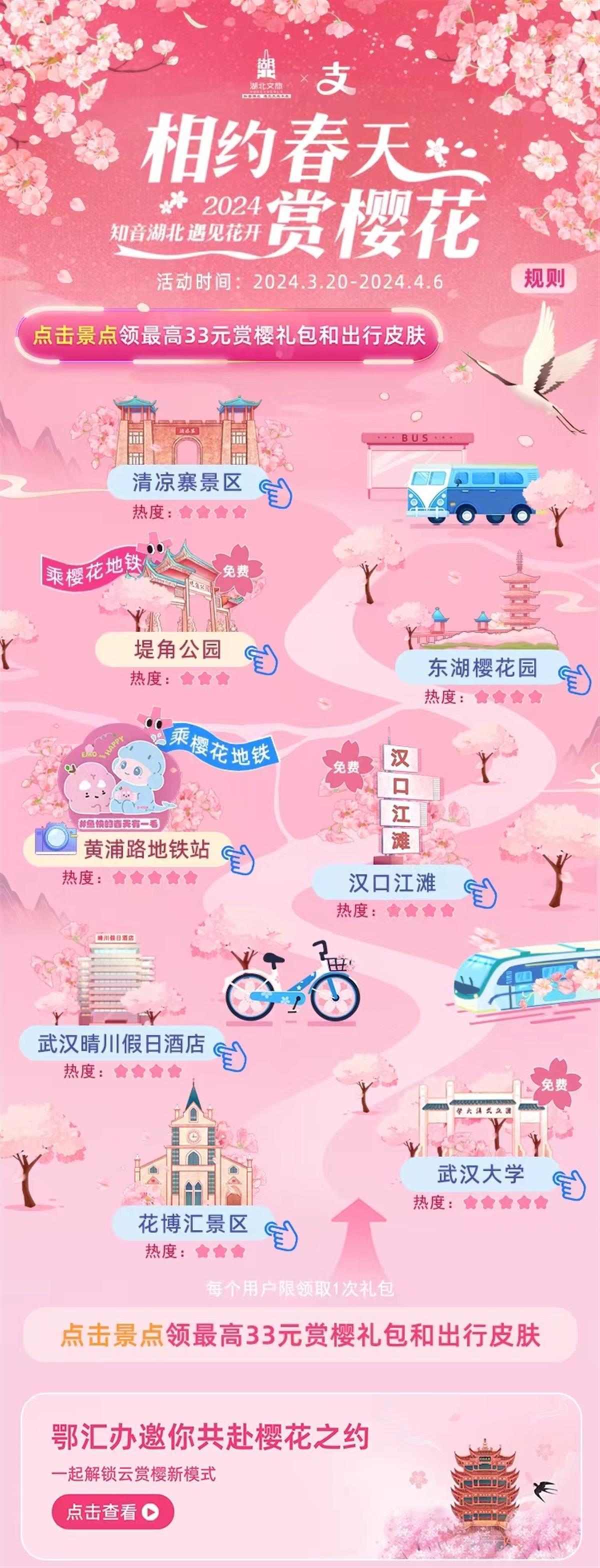 此外,鄂汇办联合湖北发布、湖北交警生活号,还为您带来云赏樱专题直播、湖北数字文旅集团携手支付宝文旅与湖北云雷信息技术有限公司,共同推出了《千樱春色》系列数字文创盲盒。更有惊喜限定隐藏款,还有机会获得5A景区门票大礼包。